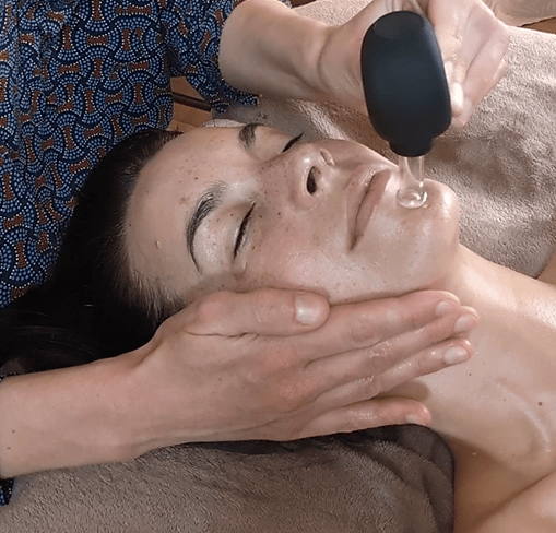 Le massage Gua Sha, utilisé en phase active puis en lissage, offre un drainage doux et une fraîcheur immédiate. La dermalgie tonifie les muscles, redessine les contours et lisse visiblement les traits, tandis que des points d’acupression viennent harmoniser l’énergie.